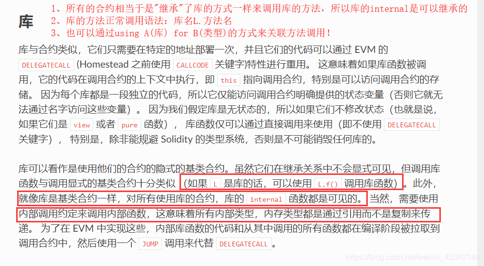 L 是库的话,可以使用 L.f() 调用库函数)。此外,就像库是基类合约一样,对所有使用库的合约,库的 internal 函数都是可见的。 当然,需要使用内部调用约定来调用内部函数,这意味着所有内部类型,内存类型都是通过引用而不是复制来传递。